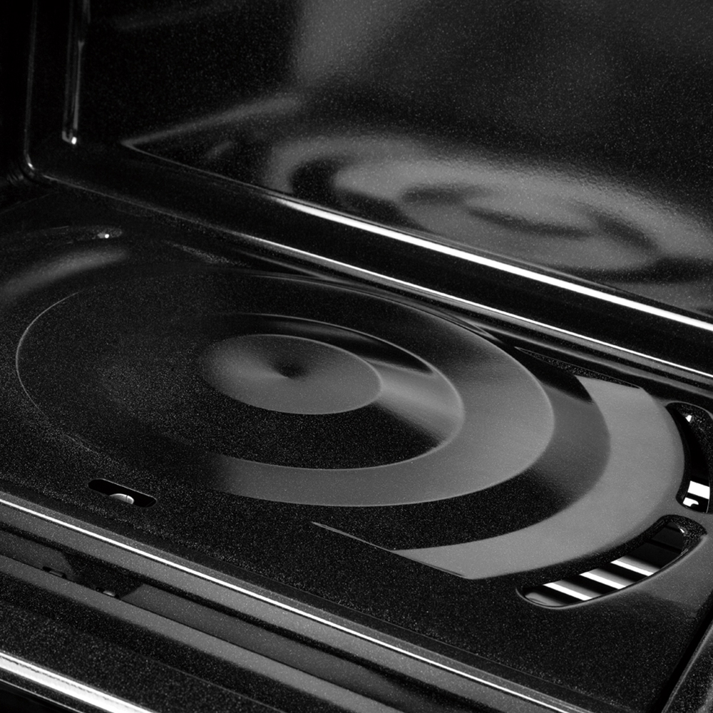 Diseño de la cavidad de horno, que distribuye mejor el calor en toda la cavidad, recubrimiento pirolítico en toda la cavidad y tamaño optimizado donde se pueden utilizar el 99% de los recipientes para horno y con tiempos de precalentamiento cortos.