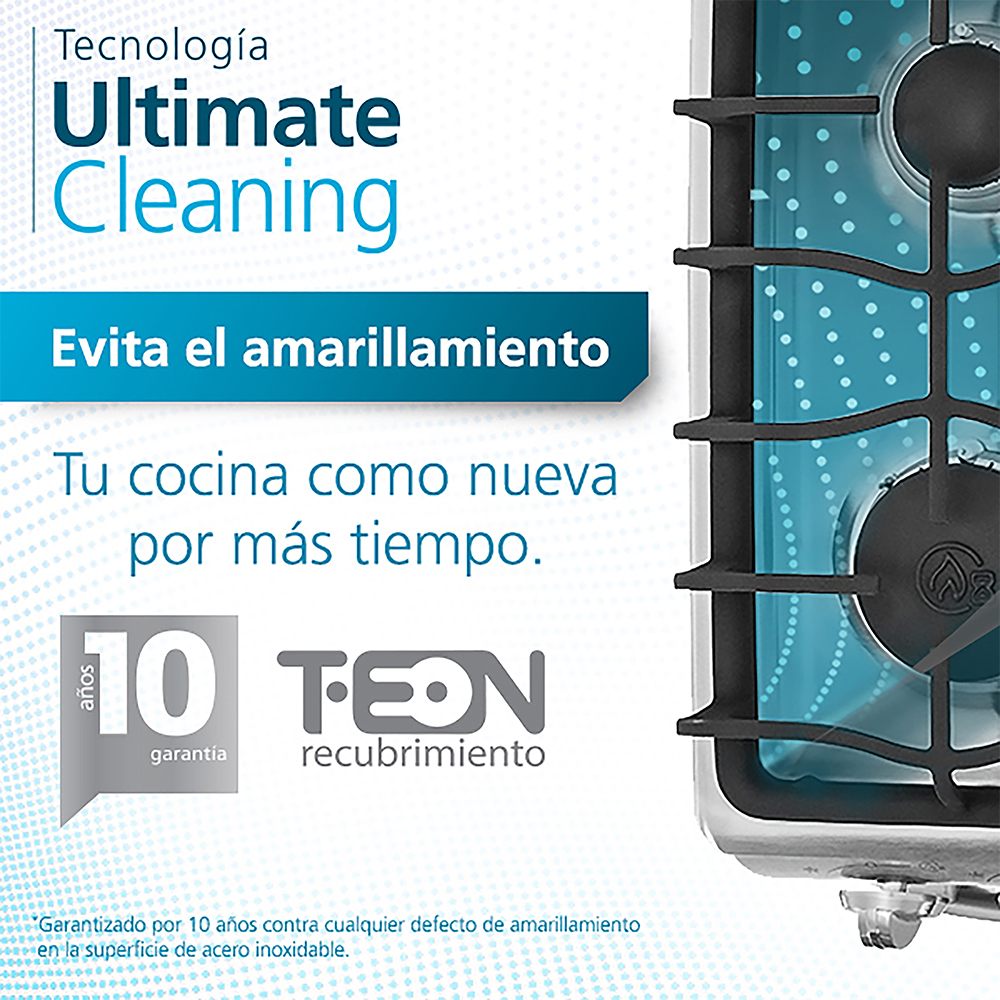 Quemadores Tech, que expande el calor de forma más homogénea en el recipiente. Parrillas continuas de fundición, gran estabilidad para desplazar ollas fácilmente. Tecnología Perfect Cook, mejor distribución de calor, para un horneado uniforme. Ventana panorámica, para tener los alimentos siempre a la vista.